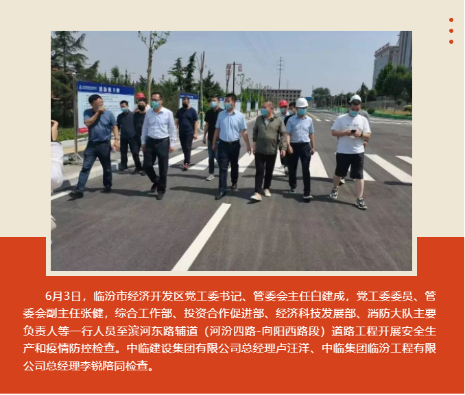臨汾市經(jīng)濟(jì)開發(fā)區(qū)黨工委書記、管委會主任白建成一行到濱河?xùn)|路輔道(河汾四路-向陽西路段)道路工程開展安 全生產(chǎn)和疫情防控檢查